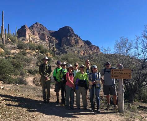 Long Group Hike: A scenic loop hike of approximately 8.6 miles counterclockwise around the mountain. Again, at least one hiking pole and two Walmart garbage bags would be good to have. Toward the end of the hike, you will be hiking a bit of the Arizona Trail system. You also have a beautiful view of the Superstitions from Flatiron to Weavers Needle. Rate ( Moderate to Moderate + because of the distance )